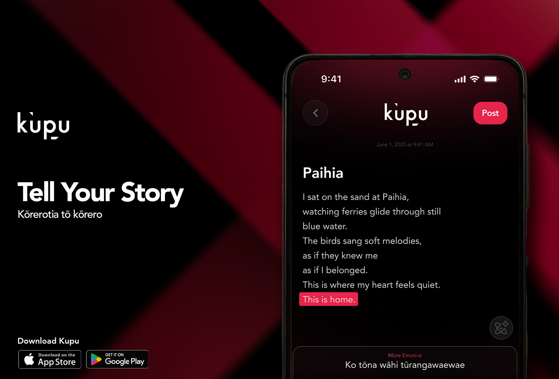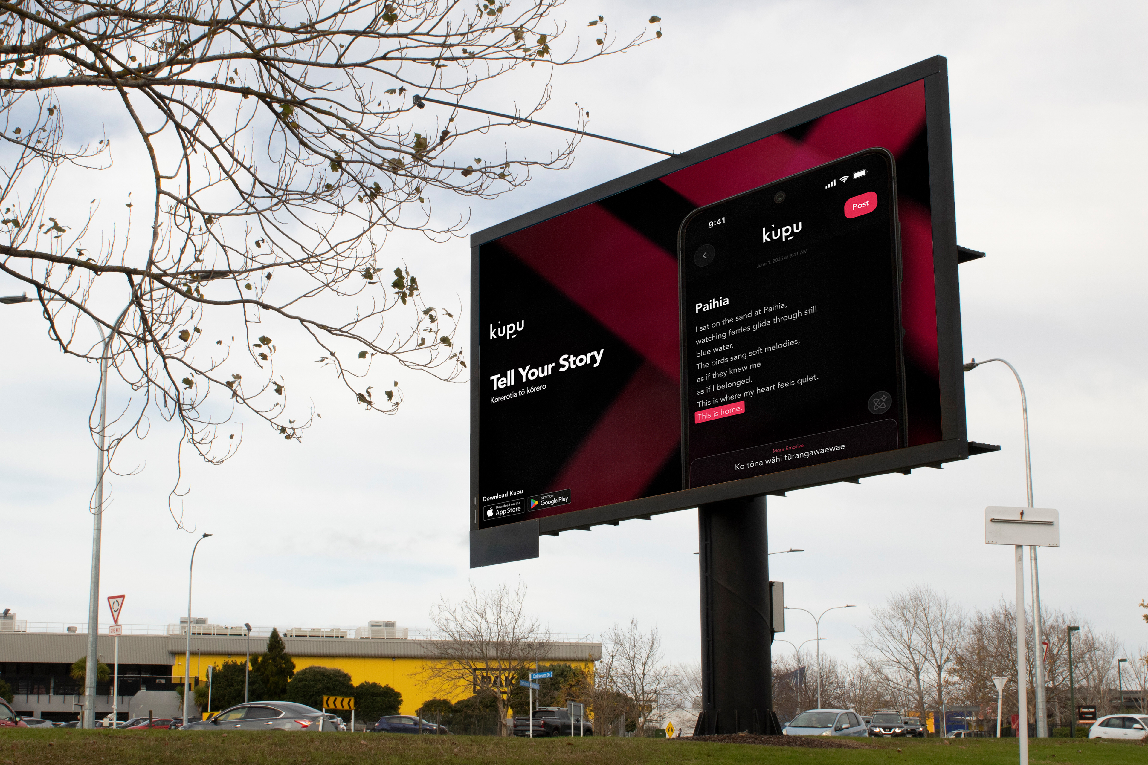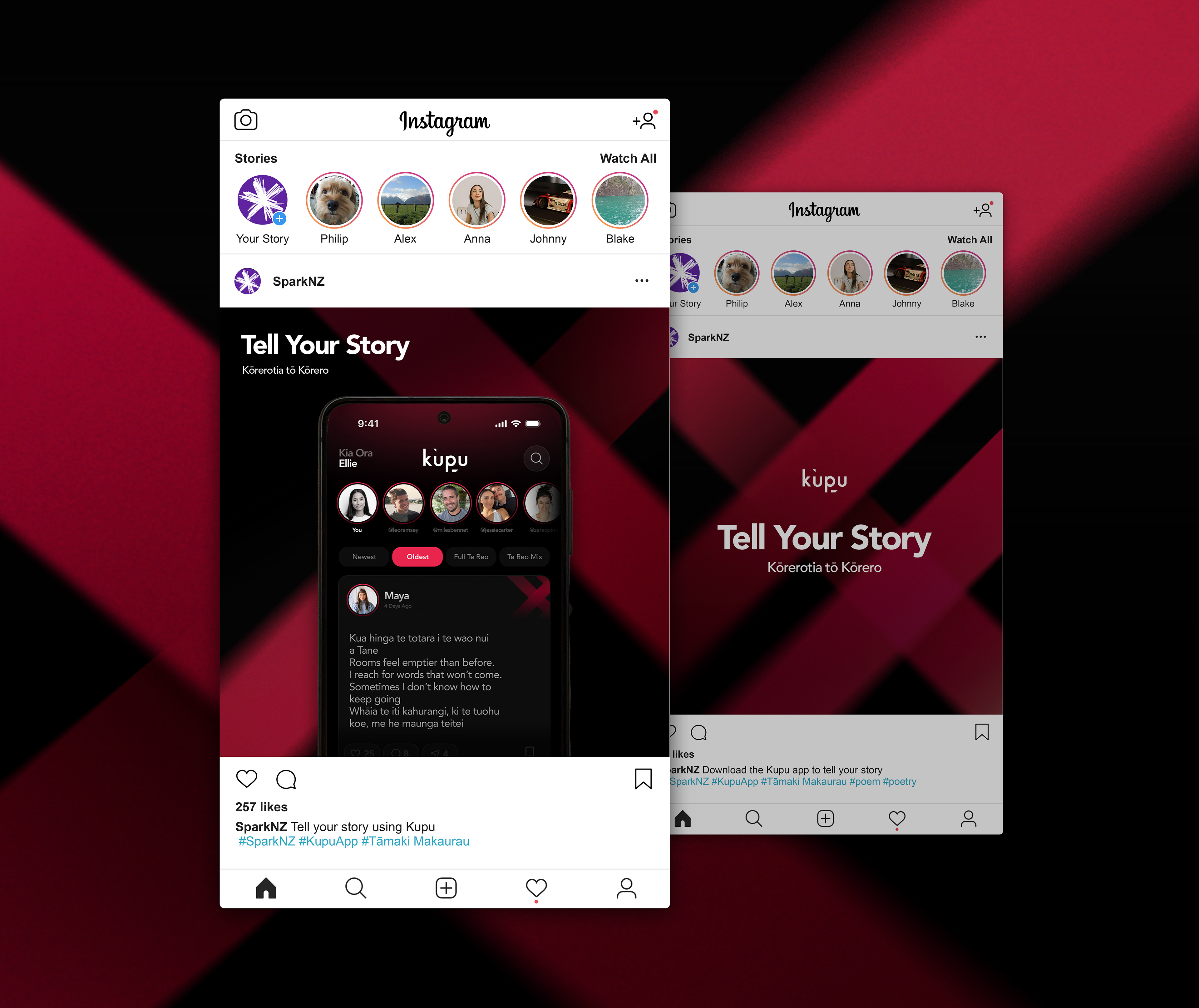 My role in the team was as lead graphic designer. In this role, I developed a visual identity for Kupu, along with complementary assets for use in campaign collateral. Using Kupu's pre-existing weave patterns, I modified this into a more modern and digital look with gradients and textures. Alongside our new visual identity, we introduced new visual elements to support the launch. Inspired by the app’s goal of connection, we incorporated weaving patterns, a reference to flax weaving in Māori culture, to symbolise unity, community, and the intertwining of language and technology.